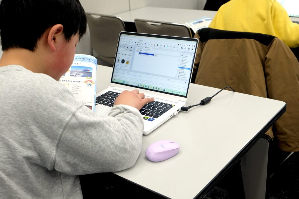 資料を見ながらプログラミングにチャレンジしている様子