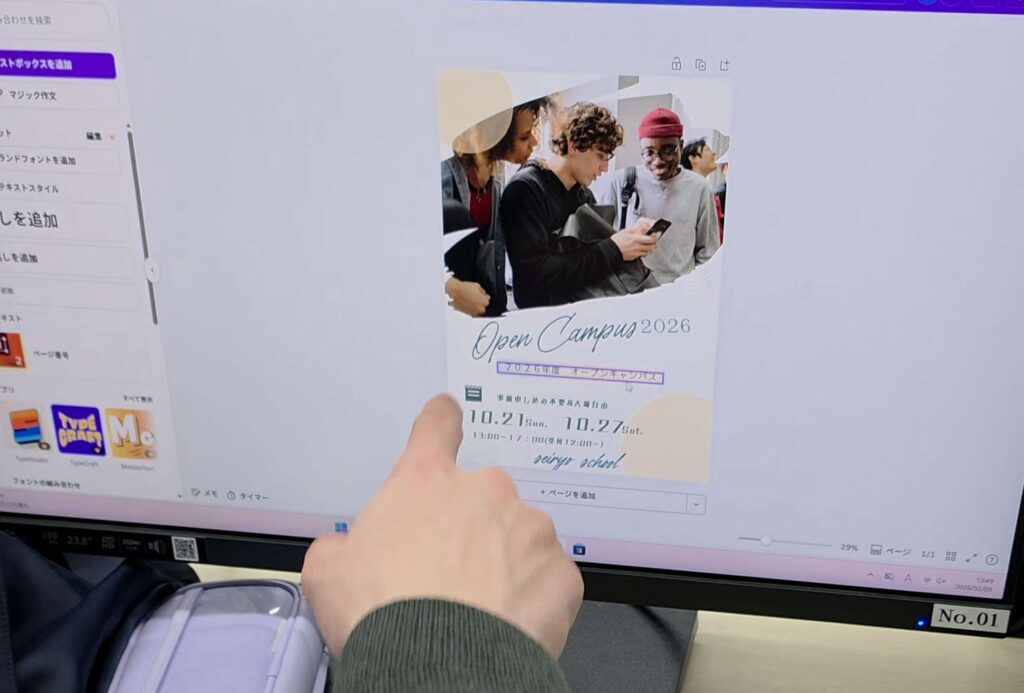 高1の生徒たちにとってはCanvaが初挑戦ということもあり、基本操作から丁寧にレクチャーしました。