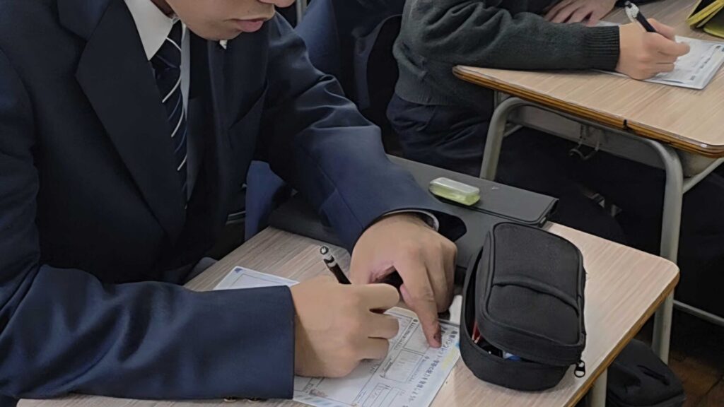 普段何気なく通っている学校のことでも、いざ「強みは?」と聞かれると、意外と言葉にするのが難しいものです。それでも生徒たちは、ワークシートに向かいながら真剣に思考を巡らせていました。教室のあちこちで活発な意見交換が行われ、教室は静かな熱気に包まれていました。